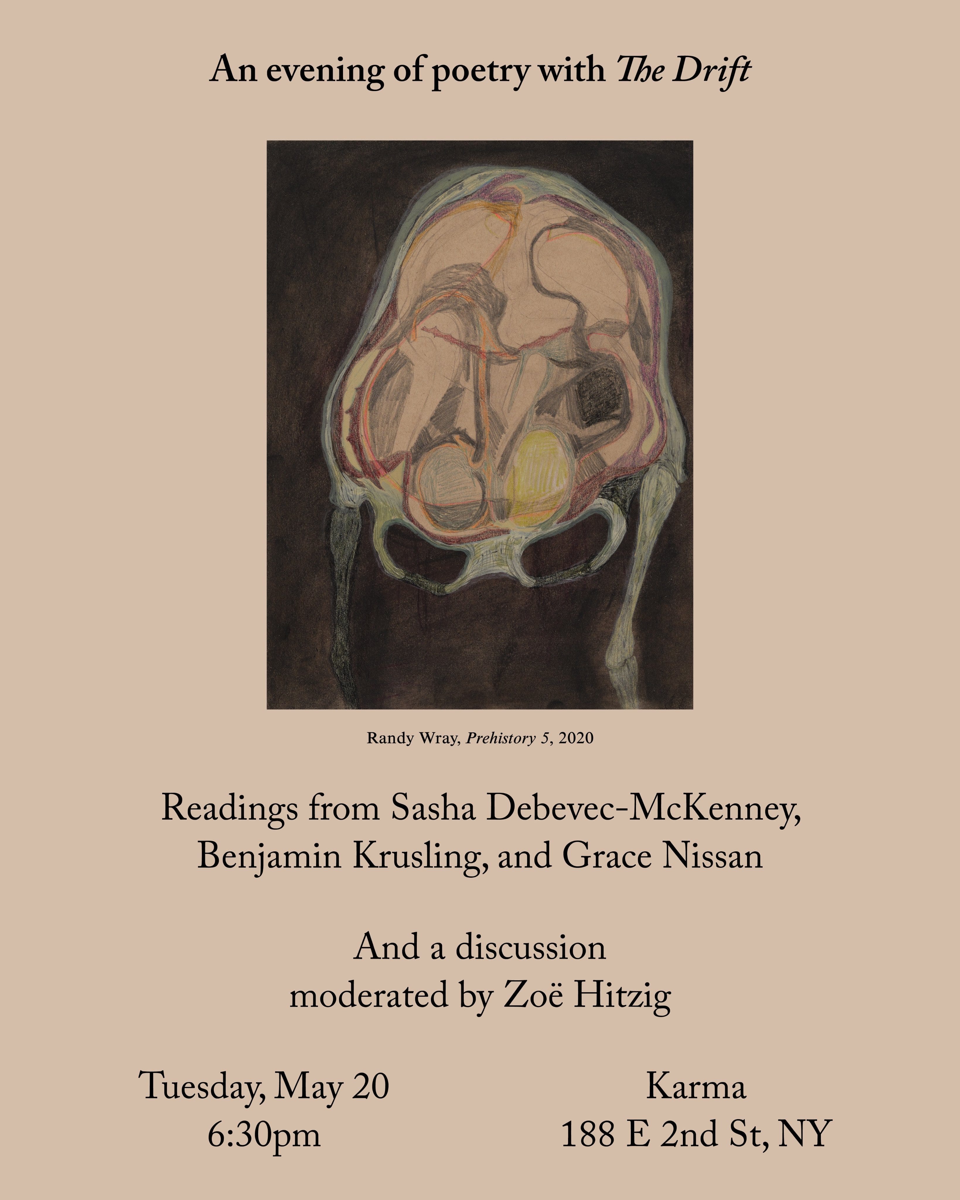 The Drift’s first poetry reading is on Tuesday! Join us at Karma in the East Village to hear our poetry editor Zoë Hitzig in conversation with three brilliant poets.