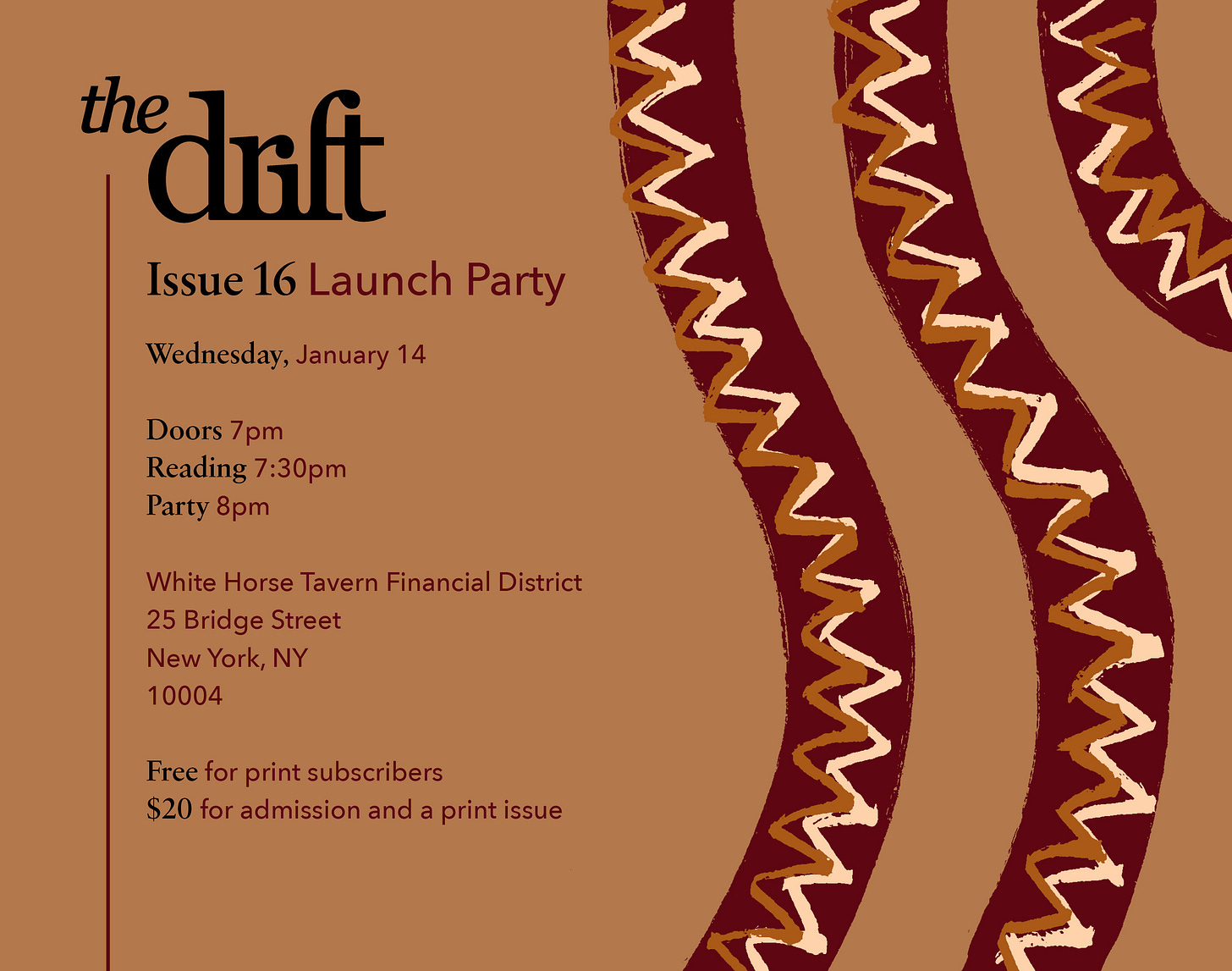 Before you sign off for the holidays, please save the date for a party in the new year. We hope you’ll join us at the White Horse Tavern in the Financial District — not the West Village pub of Dylan Thomas infamy, but the one all the way downtown at 25 Bridge Street — on January 14. We’ll be celebrating the release of Issue Sixteen with readings, music, and a respite from the cold.