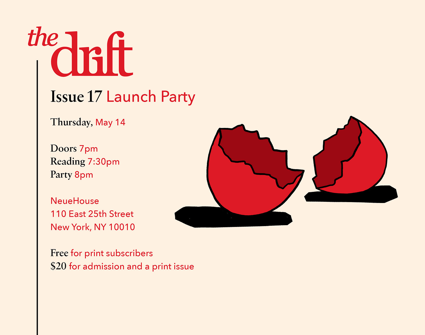 Memorial Day is often considered the unofficial start of summer, but many experts are saying that this year the season will kick off early with The Drift’s Issue Seventeen launch party on May 14. If you are in New York, we hope you will join us at NeueHouse near Madison Square at 7 p.m. As usual, we will start with a reading from issue contributors before launching into music, mingling, and revelry.